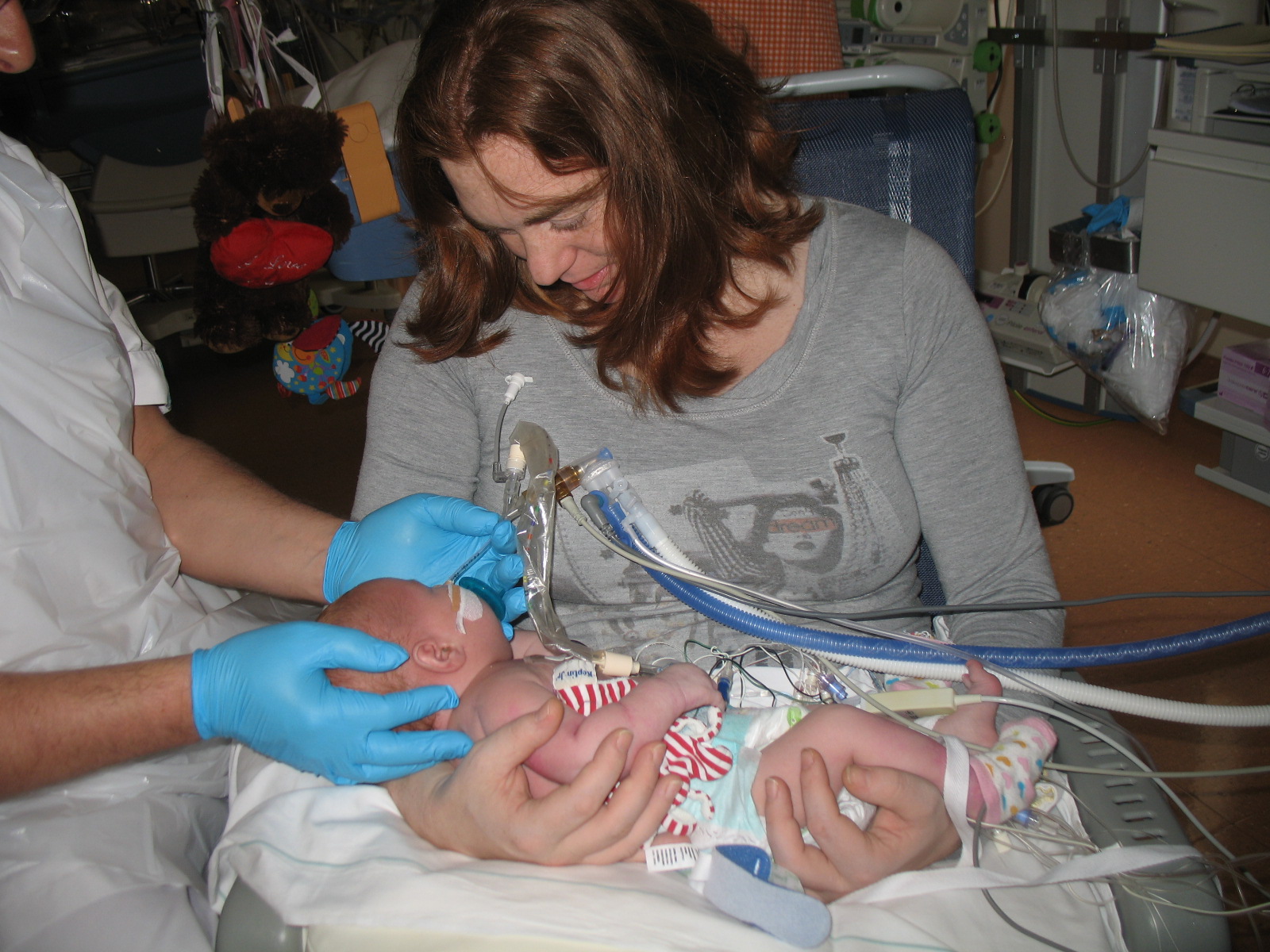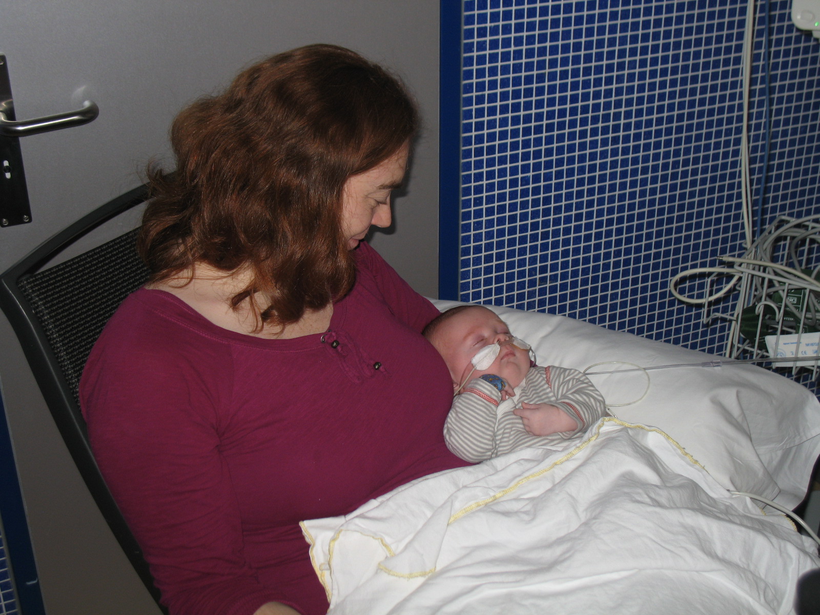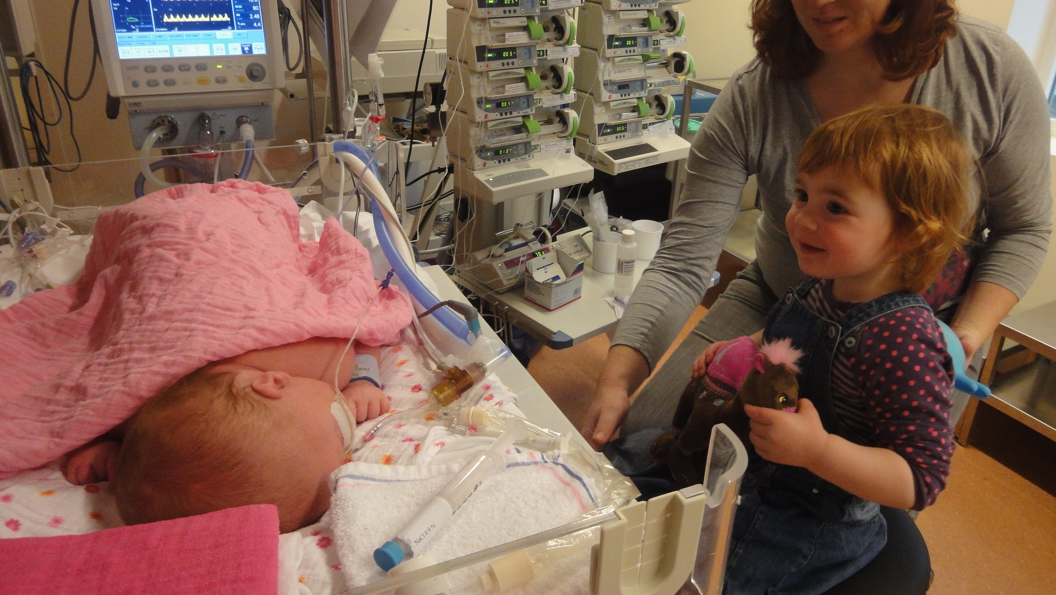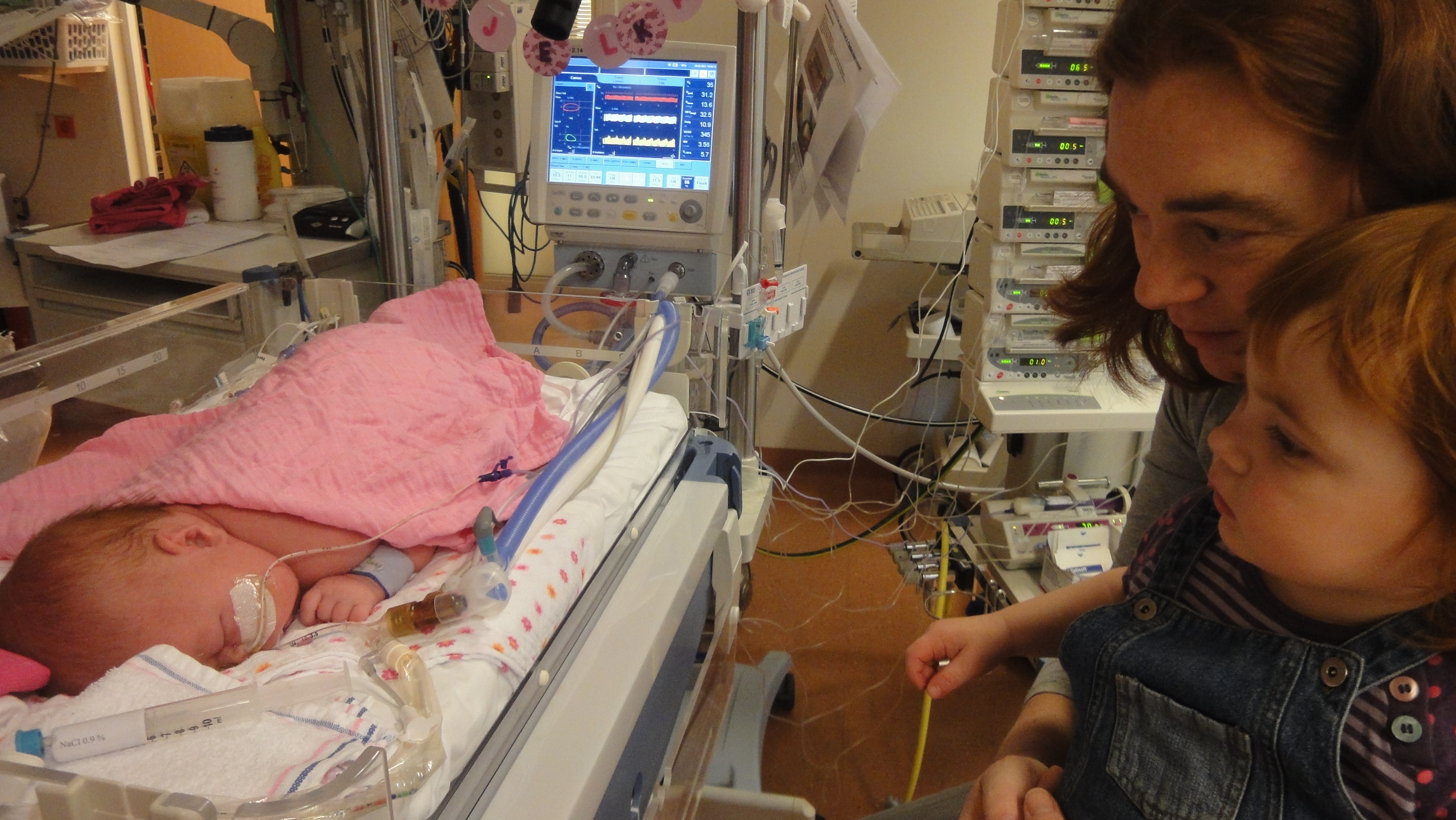 Mama kijkt vol verwondering naar Jelka, het gezichtje is weer goed te zien zonder ECMO.