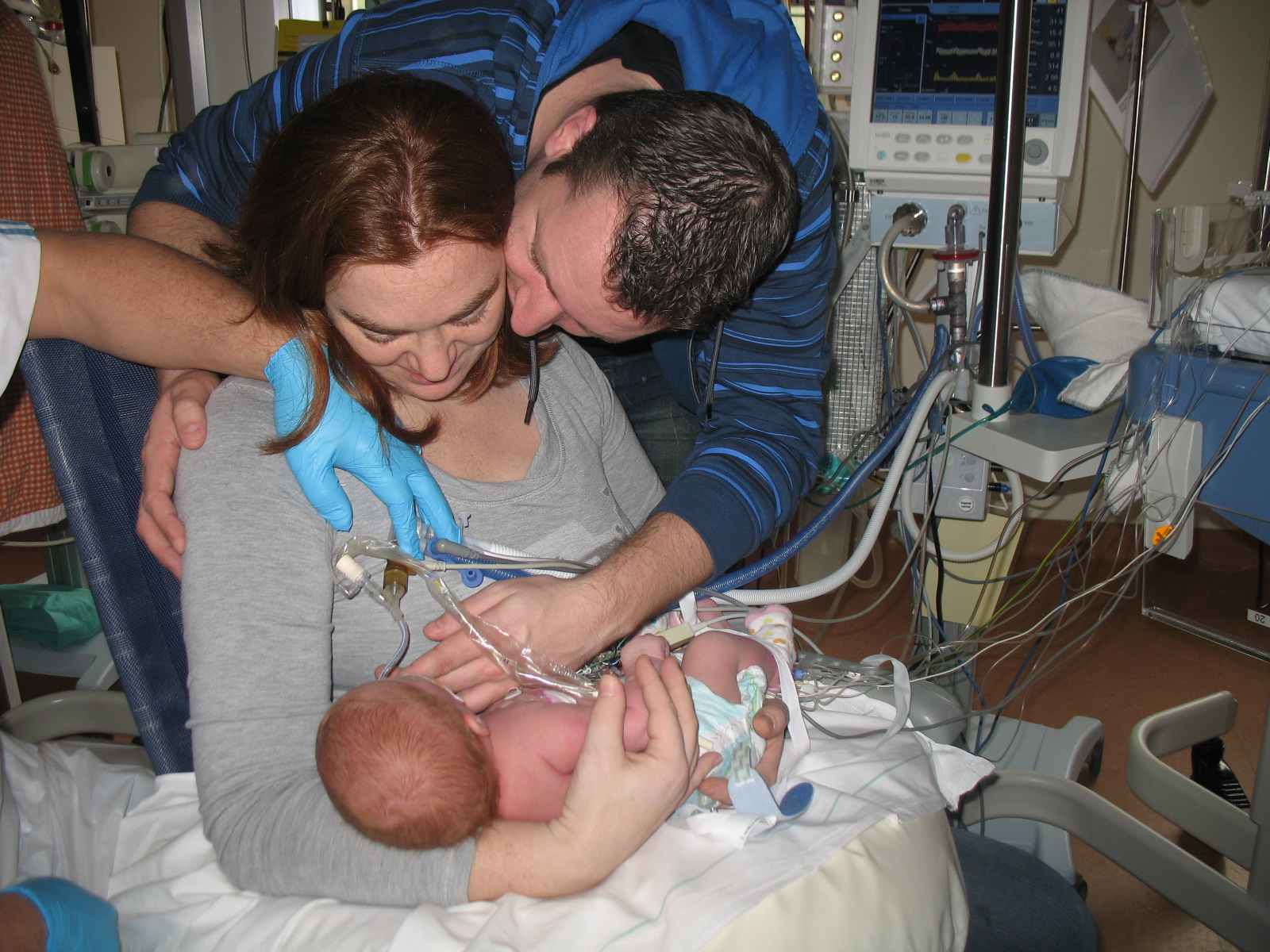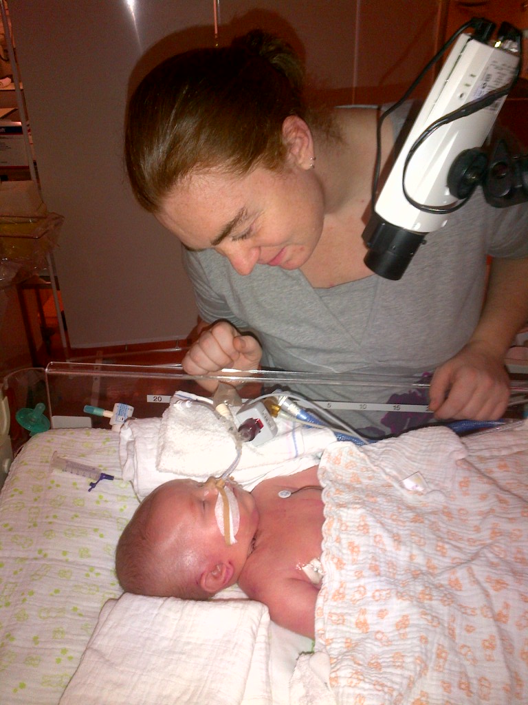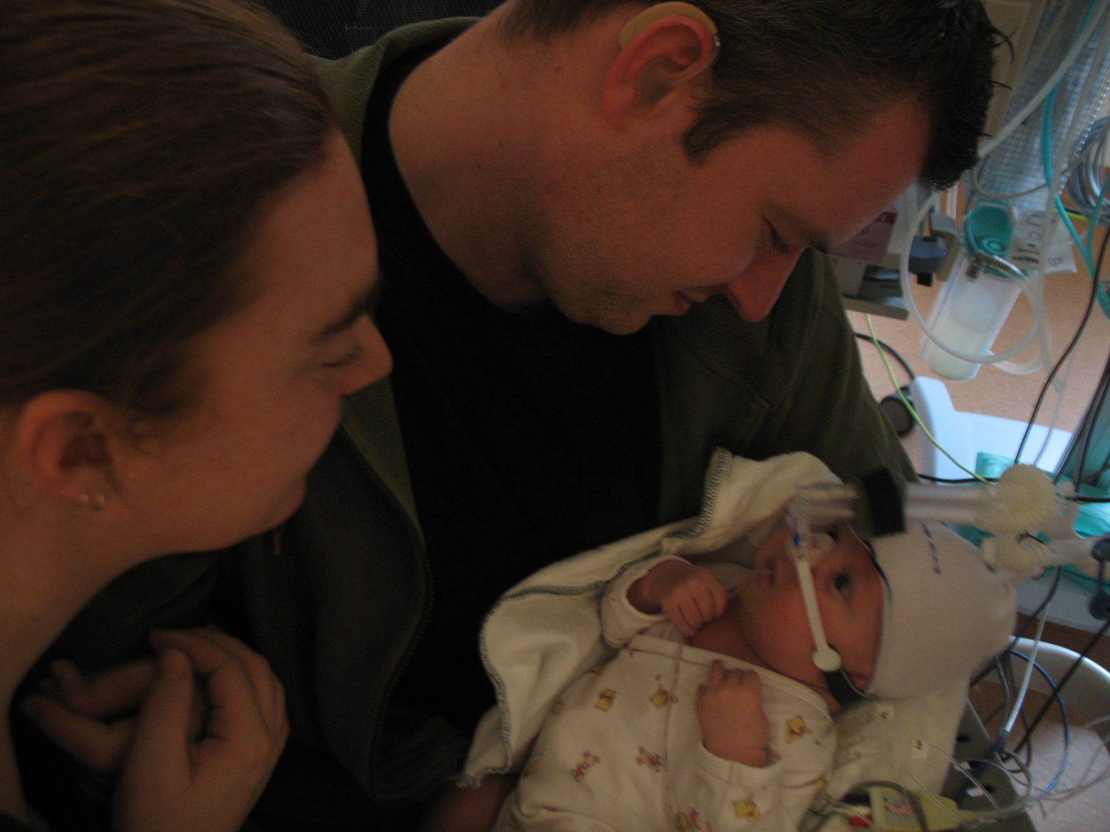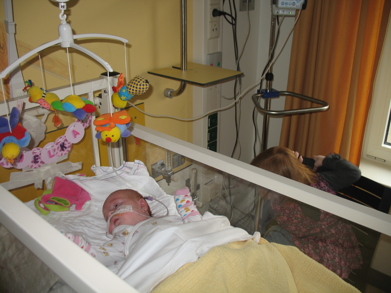 Mama kijkt vol verwondering naar Jelka, het gezichtje is weer goed te zien zonder ECMO.